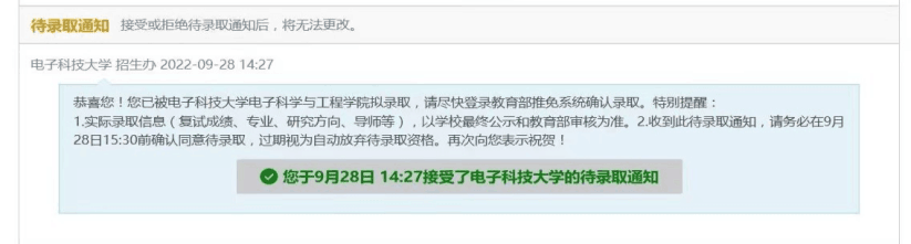 大三暑假的时候,我报名参加了一些夏令营,每当我参加夏令营宣讲的时候,我都会对自己说,这个我真的可以吗,当时自己也很焦虑,所幸在推免之路上有很多好友一起前行,可以互相倾诉缓解压力,也有很多优秀的学长学姐帮助自己解疑答惑,在他们身上我汲取到了很多力量,通过向他们学习,我在推免之路上不断地完善自我,变得更有自信,最终夏令营和预推免的结果虽然有所遗憾,但是也还算理想,先后拿到北京航空航天大学、天津大学、中科院微电子所、东南大学、西北工业大学、哈尔滨工业大学等院校优营和offer,经过考虑最终选择了电子科技大学。