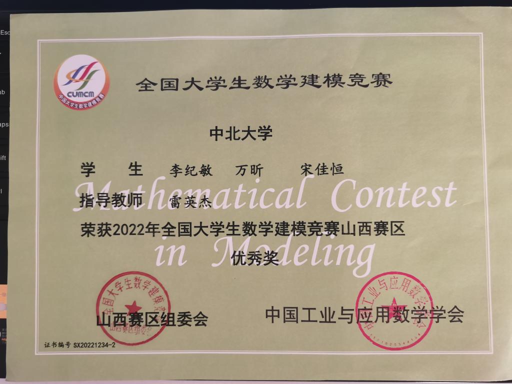 刚进入大三,我报名参加了全国数学建模大赛,三天的参赛经历,让我永生难忘,真正意义上锻炼了我的心理素质,最后一晚需要通宵追赶进度,但是却停滞不前,再加上突然得重感冒,身体和精神的双重打击,每一刻都在崩溃的边缘,无时无刻不在想放弃,是队友的鼓舞最后才咬着牙坚持了下来,至今都还记得最后提交论文时的愉悦心情,虽然结果只获得了优秀奖,但却是我克服艰险,努力奋斗的证明。