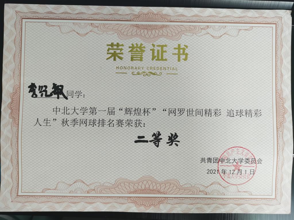 因为对网球的热爱,从来没有缺席过一次训练,从入门到熟练,在大二上学期参加了校级网球比赛,并获得了校级二等奖。