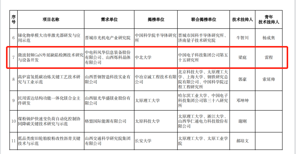 梁庭教授,青年技术挂帅人为雷程高级实验师,本项目需求方为中电科风华信息装备股份有限公司和山西烁科晶体有限公司,联合揭榜单位为中国电子科技集团公司第五十五所。