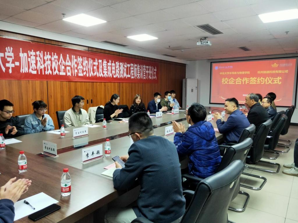 李仰军书记对加速科技黄雯总经理一行的到来表示热烈欢迎和衷心感谢,愿双方共同发力,把学院的人才培养工作推上一个新的台阶;唐军院长介绍了学院的成立背景、办学方向和人才培养模式,唐院长表示,学院将持续对接半导体产业需求,与企业同行,推动本科生培养改革不断深入。黄雯总经理向学院领导和学生代表介绍了加速科技有限公司的基本情况,她说,加速科技是一群来自农村的大学生创立的公司,怀揣着最朴实的报国梦,力争在未来5年内为半导体产业输送1万名半导体产业工程师,公司愿与学院建立最密切的合作,推动人才培养改革不断深入。双方签订了为期5年的战略合作协议。