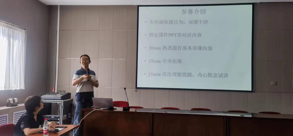 随后董成伟老师以山西省物理课程青年教学大赛一等奖参赛题目-双缝干涉课堂教学为例进行经验分享,提出教学中要明确课程在人才培养体系中的位置,以“师生学习共同体”的心态来理解新时代教与学的关系。颉琦老师以山西省物理课程青年教学大赛二等奖参赛题目-静电场的高斯定理为例,对教师们提出的问题分享了自己的教学经验,指出教学中要关注关键少数的需求,以学生发展为中心来设计课程。王旭老师进行教学创新大赛和课程思政大赛经历进行经验汇报,她从赛前准备、现场汇报和赛后反思等方面分享了自己参加大赛的经验,也提出了在教学中遇到的挑战和困惑。