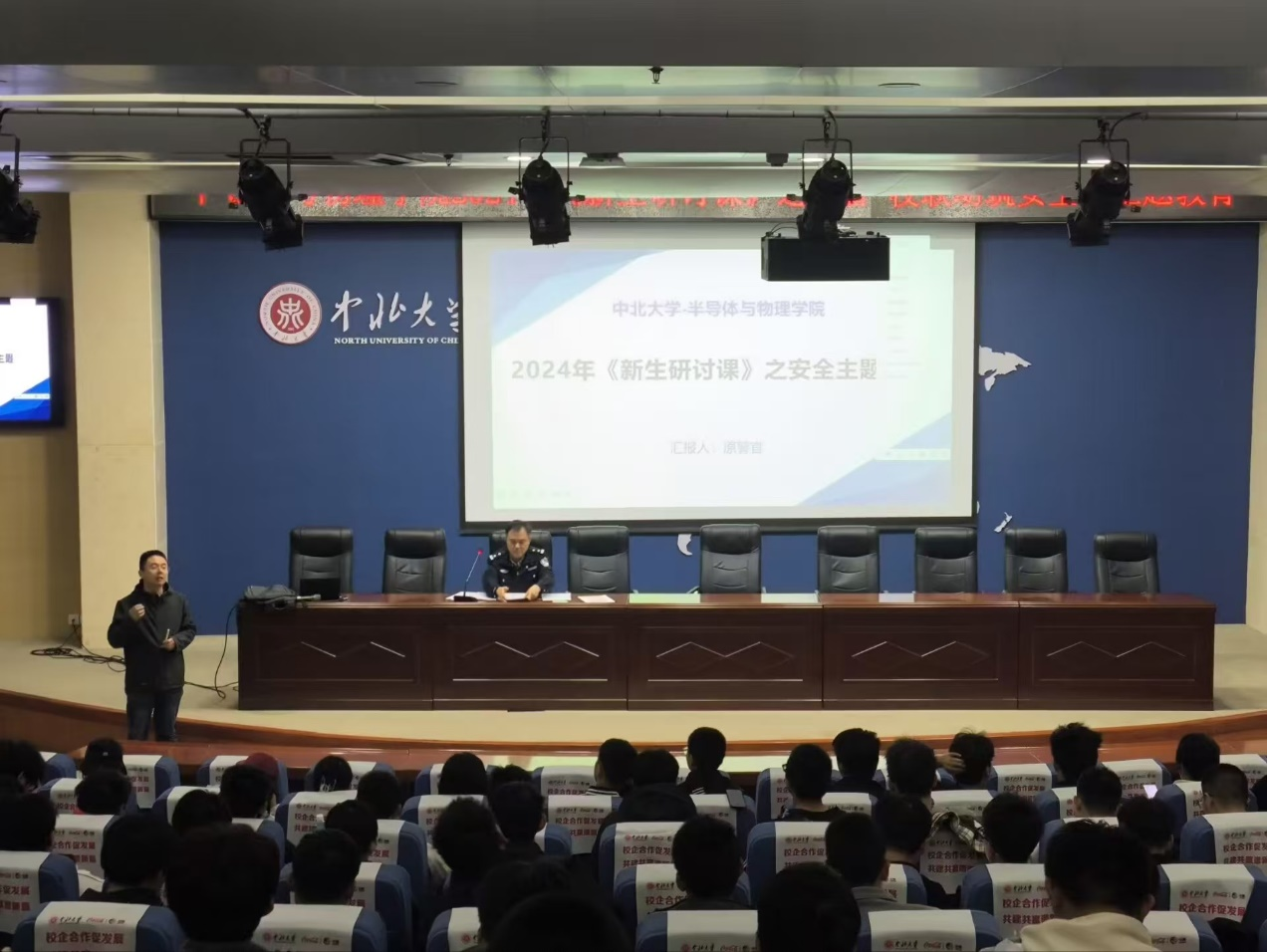 于瑾瑜国际会议中心举办以安全教育主题的新生研讨课,旨在通过警校合作,提高学生的安全意识并增强自我保护能力,预防和减少校园安全事故。本次课程由原警官进行授课并由李丰超老师主持。