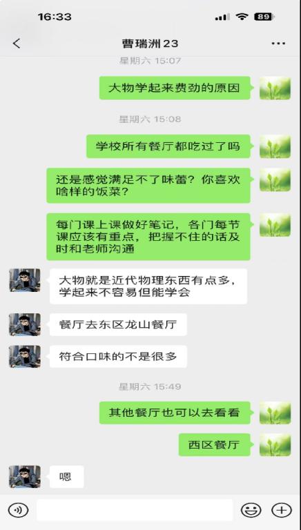 本学期学业导师崔文丽老师组织23级帮助成长的5名同学(2319014234赫宇、2319014214杨嘉显、2319014217曹瑞洲、2319014235马榕谦、2319014223贾文龙)召开了线上视频会议,积极了解学生学习与生活的基本情况,并要求他们提交了有关学习方面的所思所想,具体提交素材如下: