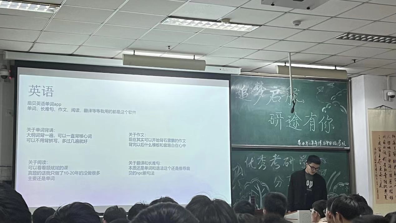 “追梦启航 研途有你”优秀考研学生分享会在11112教室举行。活动邀请了考研成功上岸的学生代表任钧显、邢新泽、郝晋华、李星宇为同学们分享了他们宝贵的学习经验,大一、大二学生积极踊跃参加了本次活动,活动由周远乐、王鑫琦、李佳芮与赵君正四位同学主持。