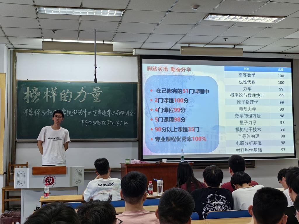 下一位进行分享的是薛景泰学长。开始,学长介绍了他的复习方法。可以大量买题,大量做题,这样就能做到成绩稳步提升;强调了英语四级,六级等重要性,并建议我们要多参加比赛。尽管可能拿不到很高的奖项,但在参加比赛的过程中也能学到很多知识,这对我们都是很有帮助的。多参加实践活动,全面发展,奉献自己。最后,学长介绍了升学的途径,并告诉我们要志存高远,未来可期。