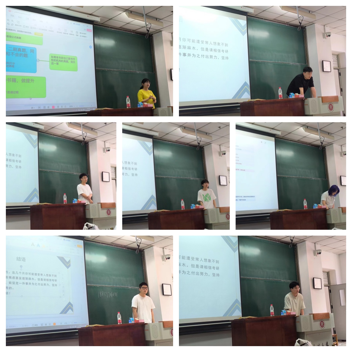 其中薛悦学姐向同学们介绍了各项学习资料的寻找方法,并主张将学习资料进行规划,针对不同阶段提出不同做法。周游学长强调做笔记的重要性,无论线下或是网课,都要认识到笔记的重要性,同时要重视课后做题的重要性,做好课后强化知识点,推荐大家要多刷题,刷好题。袁江学长告诫同学们学习不能“干啃”书,对于专业课要有质疑态度,不要不懂装懂,囫囵吞枣,应积极向专业课老师或同学等请教,充分利用身边资源,为备战考研提前做好充分准备。考研是场持久战,需要大家制定合理计划,坚持到最后。